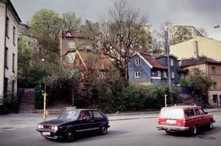 gateløp, trehusbebyggelse, bygårder, bil... Fotograf Flaatten, Harriet – 1992