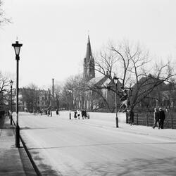 Parken ved Sagene Kirke. Desember 1951 Fotograf Thorbjørn Skotaam, "Timmie" – 1951