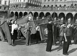1. mai 1955, flaggparade på Youngstorget... Fotograf Ukjent – 1955
