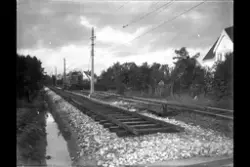 Trikkeskinner bebyggelse foran et verkst... Fotograf Ukjent –