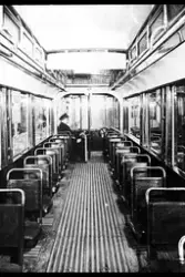 Interiøret i en trikk med trikkefører. Fotograf Ukjent –