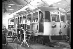 Vogn på Holmenkollbanens verksted på Maj... Fotograf Ukjent –