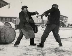 En slåsskamp for å holde varmen. Fotograf Storløkken, Aage – 1950