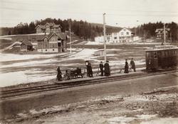 To trikker ved stasjonsbygning på holdep... – 1900