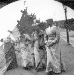 Tre kvinner spaserer i bygate, Oslo. Hes... Fotograf Størmer, Fredrik Carl Mülertz – 1893 – 1897
