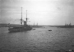 britisk flåtebesøk, fjord, marinefartøye... Fotograf Neupert, Hermann Christian – 1908