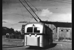 Trolley-buss på vei mot en holdeplass, h... Fotograf Ukjent –