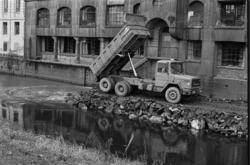 elv, lastebil, fylling av masse, bygårde... Fotograf Heiberg, Sverre – 1975 – 1989