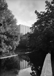 elv, gangbro, foss, fabrikkbygninger Fotograf ukjent person – 1960