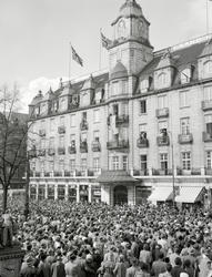 Folkemengde foran Grand Hotel under den ... Fotograf Ukjent – 1955