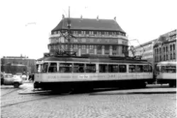 Trikk ved Handelsbygningen. Fotograf Heiberg, Sverre – 1953