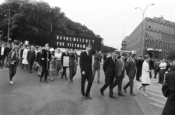 Demonstrasjon mot USA's krigføring i Vietnam utenfor Den amerikanske ambassade på Drammensveien (Nå Henrik Ibsens gate) i Oslo. Tor Bjerkmann, Thorbjørn Berntsen, ukj, Einar Førde og Ingrid Eide i forreste rekke. 4. juli 1966.