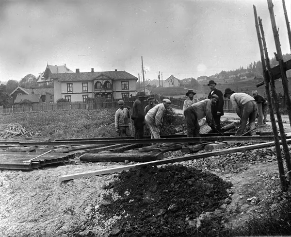 Formann Anton Torvik sammen med anleggsfolkene som arbeider med å legge sidespor fra Grefsen jernbanestasjon til Christiania Spigerverk, her ved Sandakerveien,.1915