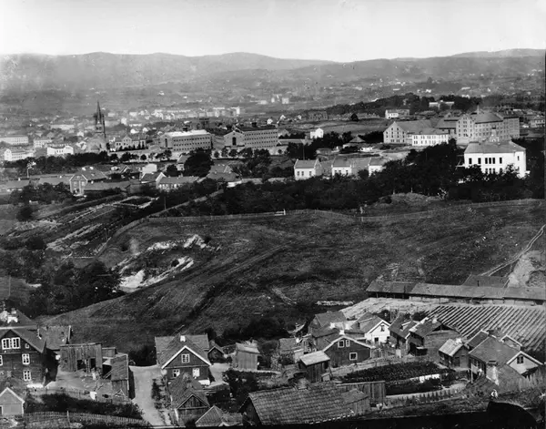 Utsikt fra Galgeberg i 1870-årene. Grønland Kirke, Bodsfengselet og "bayern", bryggeriet som senere ble Kretsfengsel. Den hvite villaen til høyre tilhører Onsum. Funksjonærboligene ligger til venstre for villaen. I boligene i forgrunnen ligger arbeiderboligene, i Ekebergskrenten.