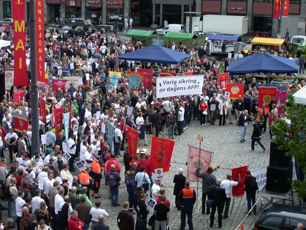 Opp mot 4.000 deltok i demonstrasjonen for AFP og mot pensjonsforliket på Youngstorget. Titusener streiket over hele landet. I Oslo sto blant annet T-baner og trikk. Gatas Parlament og Byggband underholdt og det var tale ved LO i Oslos leder Kleiv Fiskvik og en rekke appeller før de frammøtte toget til departementet hvor det ble overlevert et protestskriv til Bjarne Håkon Hansen.9. mai 2007.