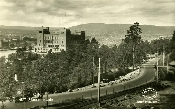 Sjømannsskolen sto ferdig 1917. Tegnet av arkitektene Andreas Bjercke og Georg Eliassen. Bygd av tegl og delvis kledd med iddefjordsgranitt. Kongsveien i forgrunnen.
