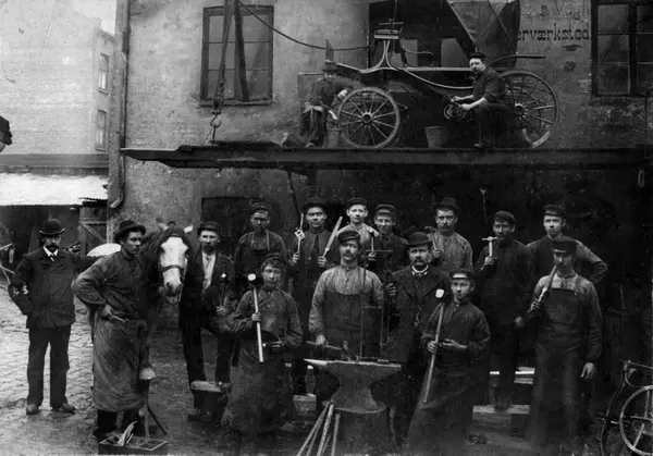 En gruppe vognsmeder og hovslagere hos firmaet Fjeld i Nordbygata, .1898