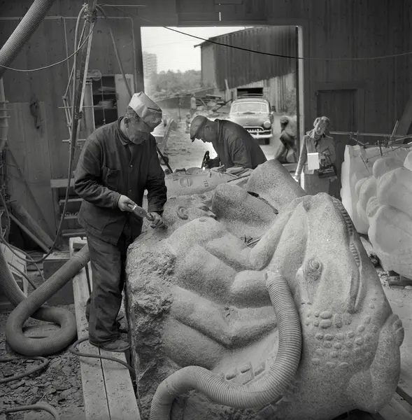 Norsk Billedhoggerforening og AL Steinskulpturs verksted på Helsfyr. Johan Sørensen og Arve Olsen arbeider på en skulptur av den amerikanske kunstneren Marshall Fredericks. Juni 1957.