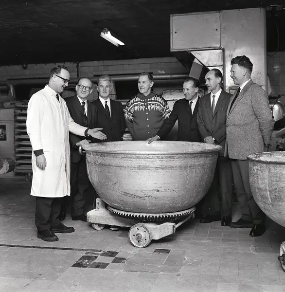 Styret i Grünerløkka Aktiebakeri a.s på befaring i Sim. Solbergs produksjonsanlegg. Fra v.: Disponent Harald Hovind og styremedlemmene Oscar Pettersen, Johan Pettersen, Arvid Larsen, Gunnar Sandersen (personalets representant i styret), Erling Rodvang og styreformannen, Odd Hübenbecker. Januar 1965