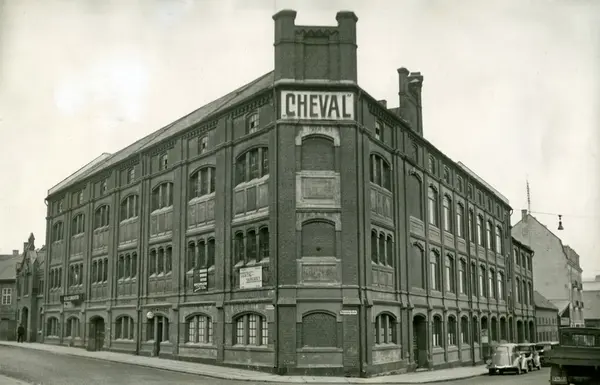 "Cheval" dyrehospital. "Opstalning av hester og hunder, skosmie og hundebad. Hospitalet lå på hjørnet av Holmens gade, Bakkegaden og Skolestrædet i Pipervika. Siste halvdel av 1930-tallet.