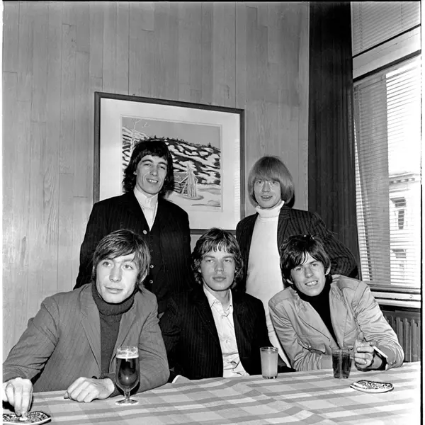The Rolling Stones på Hotell Viking i Oslo,.23. juni 1965. .Sittende fra venstre Charlie Watts, Mick Jagger og Keith Richards. Stående fra v. Bill Wyman og Brian Jones.