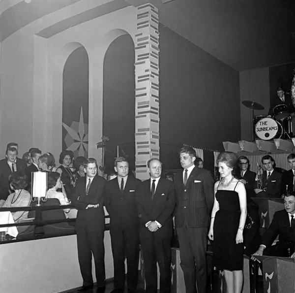 Arbeiderbladets amatørkonkurranse på Rondo. Juryen under finalen 2. april 1963. Fra venstre: Erik Heyerdahl, Rolv Wesenlund, Erik Lassen, Johnny Bergh og publikums representant, Brit Berger. ..