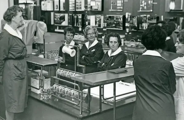 Prisstreiken 7. oktober 1970. Alle LO-organiserte i Norge la ned arbeidet i ett kvarter. Kassadamene ved Glassmagasinet tok ikke imot penger fra kundene under kvarters-streiken. Fri Fagbevegelse Nr. 12. 1970..Foto: Erik Nilsen/Artur Bruflat.
