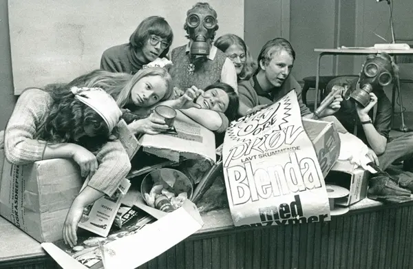 Teatergruppen ved Forsøksgymnaset i Oslo. Forestillingen "Gift" ble vist første gang 25 april 1969 og bød på selvskrevne tekster med kommentarer til aktuelle spørsmål i tiden, som miljøforurensning og forbrukerreklame. .