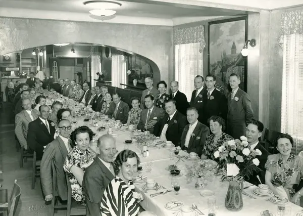 Oslo Kelnerforening møtes på restaurant Schrøder i Folkets Hus, som lå på hjørnet av Henriks Ibsens gate og Torggt. Stående til venstre, foreningens formann, Wilhelm P. Sommer,.1950-55.