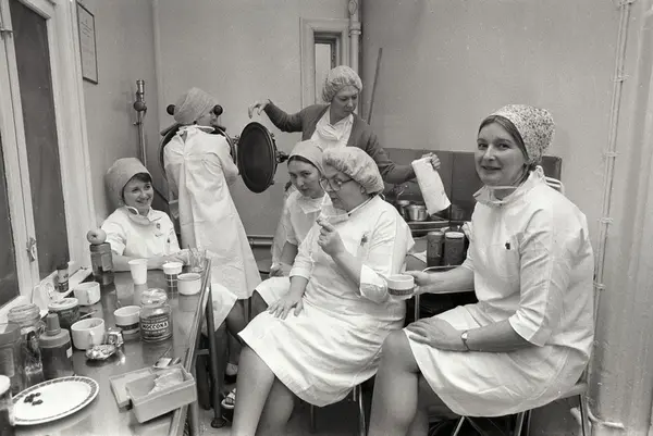 Rikshospitalet, januar 1980..I forgrunnen inntas lunsj. Bak steriliseres apparatene i autoklaven. Fra v.: Kari Skree, Marit Heldahl, Helene Hemstad, Målfrid Ohnstad, bak: Margriet van der Berg, Inger Mæland...