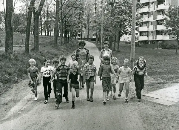 Barnehagetantene (som det het i 1980) Ragnhild Minotti og Berit Amundsen med en flokk barn fra Sørlihellinga barnehage på Tveita..Foto Timmie Skotaam, mai 1980.