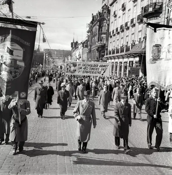 1. mai 1958 i Oslo.Demonstrasjonstoget på Karl Johans gate.Fane: Oslo Støperiarbeiderforening.Fane: Oslo Modellsnekkernes forening.Parole: Vi fastholder kravet om 40 timers uke i støperiene!.