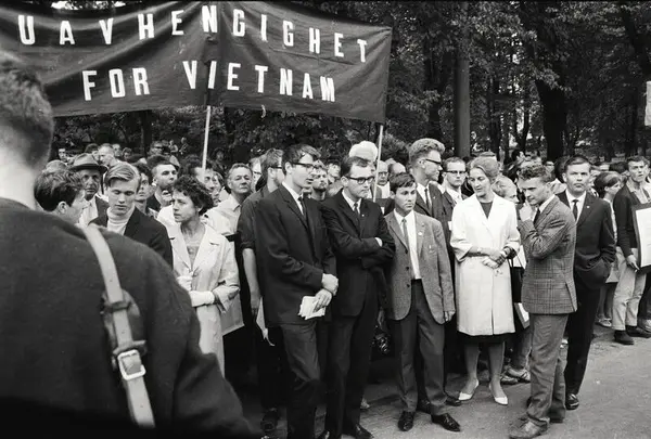 Vietnam-demonstrasjon utenfor Den amerikanske ambassaden på Drammensveien i Oslo. Blant demonstrantene står Thorbjørn Berntsen, Tor Bjerkmann, Einar Førde, Ingrid Eide og Arvid Jacobsen. Juli 1966.