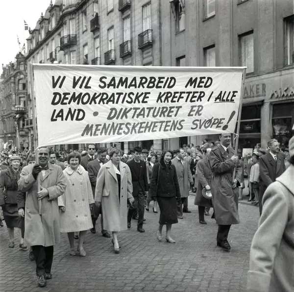 1. mai 1959 i Oslo.Karl Johans gate..Demonstrasjonstoget..Parole: Vi vil samarbeid med demokratiske krefter i alle land - Diktaturet er menneskehetens svøpe!.....