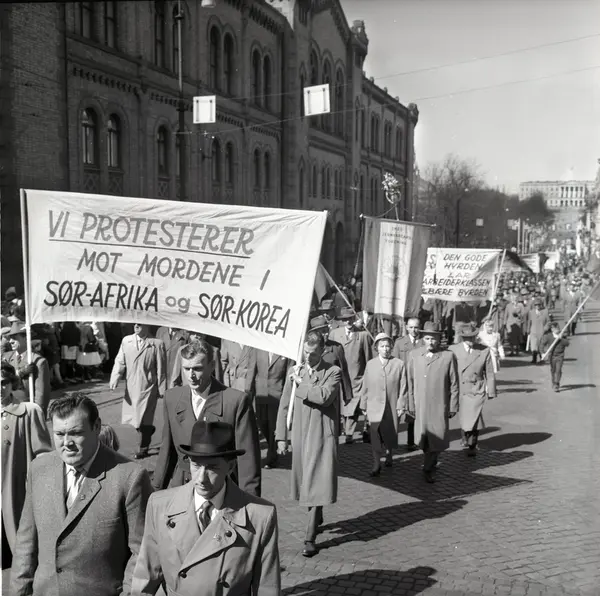 1. mai 1960 i Oslo.Karl Johans gate..Demonstrasjonstoget..Parole: Vi protesterer mot mordene i Sør-Afrika og Sør-Korea.Fane: Smed- Jernvarearb. forening