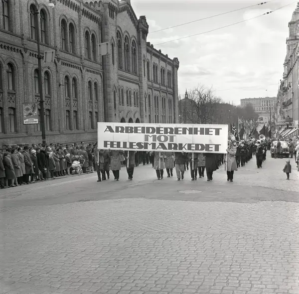 1. mai 1962 i Oslo.Demonstrasjonstog arrangert av "Faglig aksjon mot Fellesmarkedet" med støtte fra Sosialistisk Folkeparti (SF) og Norges kommunistiske parti (NKP)...Parole: Arbeiderenhet mot Fellesmarkedet