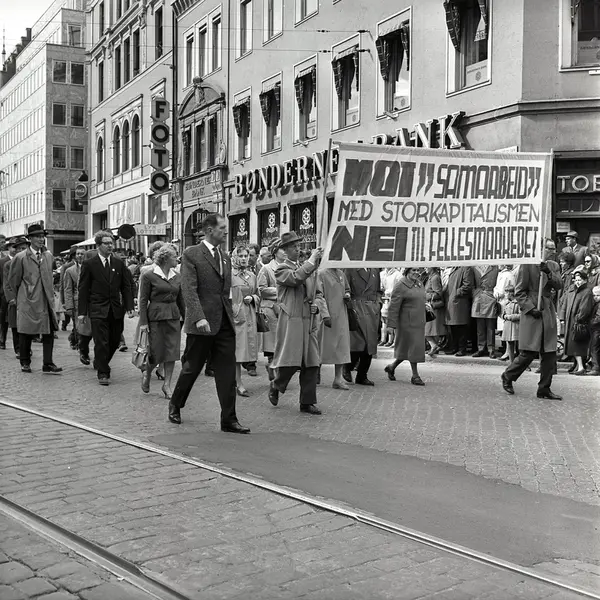 1. mai 1962 i Oslo.Demonstrasjonstog arrangert av "Faglig aksjon mot Fellesmarkedet" med støtte fra Sosialistisk Folkeparti (SF) og Norges kommunistiske parti (NKP)..Parole: Mot "samarbeid" med storkapitalismen.Nei til Fellesmarkedet..