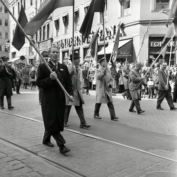 1. mai 1962 i Oslo.Demonstrasjonstog arrangert av "Faglig aksjon mot Fellesmarkedet" med støtte fra Sosialistisk Folkeparti (SF) og Norges kommunistiske parti (NKP)..