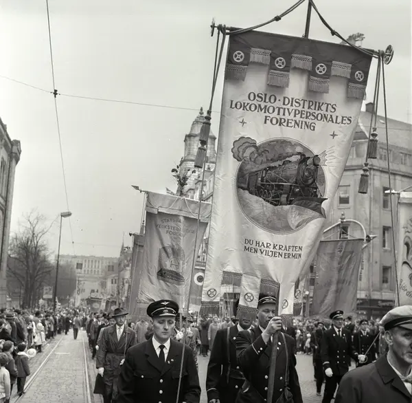 1. mai 1963 i Oslo.Demonstrasjonstoget i Karl Johans gate..Fane: Oslo distrikts Lokomotivpersonalets Forening.Fane: Statsbanens Verkstedarbeider Forening Oslo