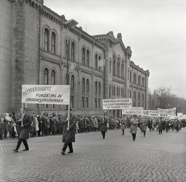 1. mai 1963 i Oslo.Demonstrasjonstog arrangert av Komiteen for faglig enhet med støtte av Sosialistisk Folkeparti (SF) og Norges Kommunistiske Parti (NKP).Parole: Rettferdigere fordeling av produksjonsøkingen.Parole: Ingen tyske offiserer eller tyske forsyningsbaser på norsk jord...