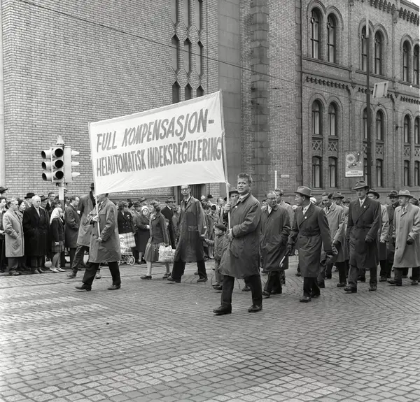 1. mai 1963 i Oslo.Demonstrasjonstog arrangert av Komiteen for faglig enhet med støtte av Sosialistisk Folkeparti (SF) og Norges Kommunistiske Parti (NKP).Parole: Full kompensasjon - helautomtatisk indeksregulering.
