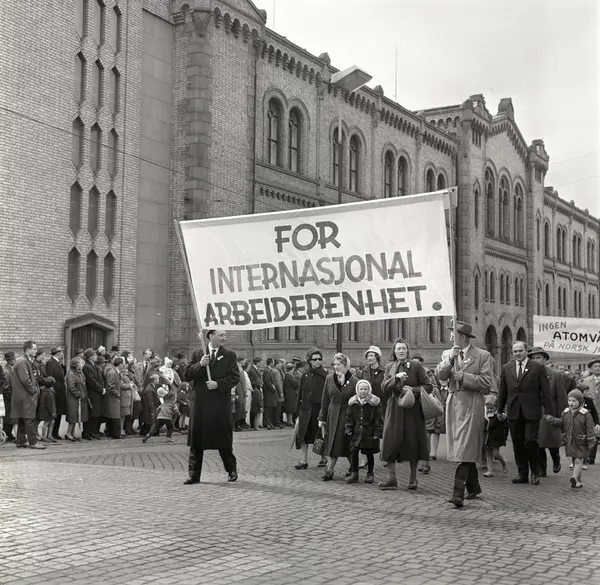 1. mai 1963 i Oslo.Demonstrasjonstog arrangert av Komiteen for faglig enhet med støtte av Sosialistisk Folkeparti (SF) og Norges Kommunistiske Parti (NKP).Parole: For internasjonal arbeiderenhet.