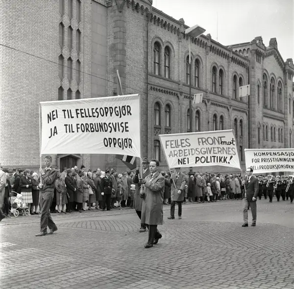 1. mai 1963 i Oslo.Demonstrasjonstog arrangert av Komiteen for faglig enhet med støtte av Sosialistisk Folkeparti (SF) og Norges Kommunistiske Parti (NKP).Parole: Nei til fellesoppgjør. Ja til forbundsvise oppgjør.Parole: Felles front mot arbeidsgivernes nei politikk
