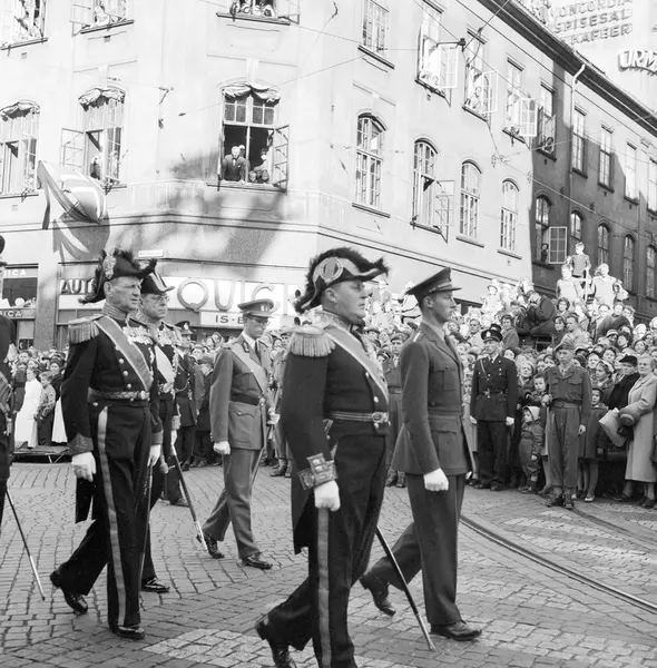 Kong Haakon VIIs gravferd - ankomst Oslo Domkirke..Bakerst fra venstre: kong Frederik 9. av Danmark, kong Gustav 6. Adolf av Sverige og kong Baudouin 1. av Belgia,.foran kronprins Olav og prins Harald,.oktober 1957