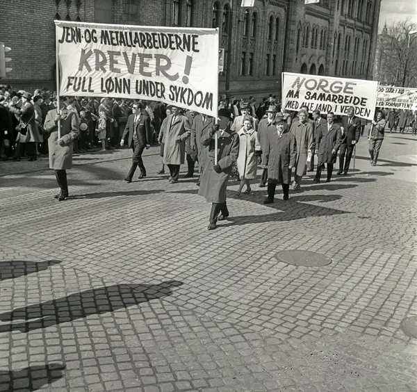 1. mai 1964 i Oslo.Demonstrasjonstoget i Karl Johans gate.Parole: Jern og metallarbeiderne krever!.Full lønn under sykdom.Parole: Norge må samarbeide med alle land i hele verden