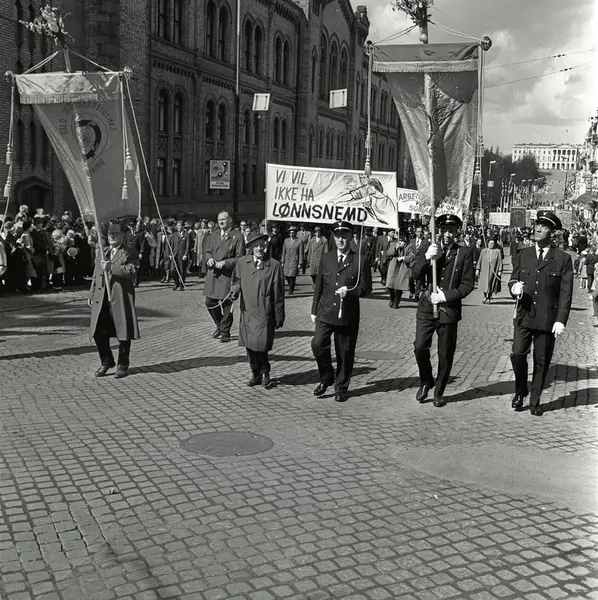 1. mai 1964 i Oslo.Demonstrasjonstoget i Karl Johans gate.Fane: Oslo Sporveisarbeideres Forening.Fane: Oslo Sporveis Betjenings Foorening.Parole: Vi vil ikke ha lønnsnemd