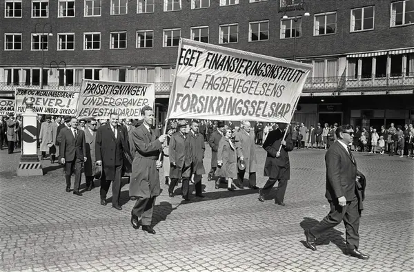 1. mai 1964 i Oslo.Demonstrasjonstoget ved Rådhusplassen.Parole: Eget finansieringsinstitutt.et fagbevegelsens forsikringsselskap.Parole: Prisstigningen undergraver levestandarden.Parole: Jern- og Metallarbeiderne krever! Full lønn under sykdom