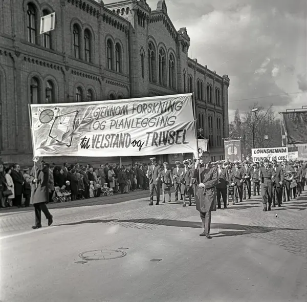 1. mai 1964 i Oslo.Demonstrasjonstoget i Karl Johans gate.Parole: Gjennom forskning og planlegging til velstand og trivsel.Parole: Lønnsnemda er tvunget på oss!