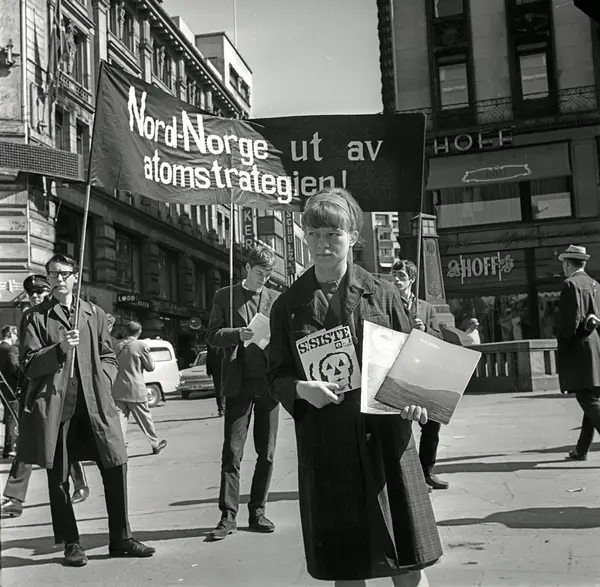 1. mai 1965 i Oslo.Kampanjen mot atomvåpen har stand på Stortings plass (Dasslokket).Parole: Nord-Norge ut av atomstrategien!.Salg av heftene Solverv og Siste