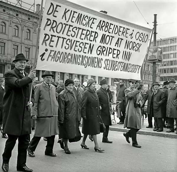 1. mai 1967 i Oslo.Demonstrasjonstoget.Parole: De kjemiske arbeidere i Oslo protesterer mot at norsk rettsvesen griper inn i fagorganisasjonens selvbestemmelsesrett